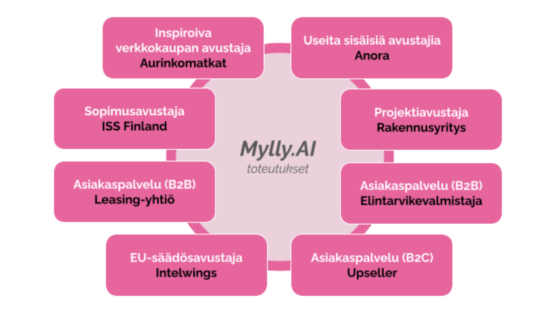 Koska Mylly.ai on yhteinen alusta meille ja asiakkaillemme, kehitystyön hedelmät saadaan nopeasti ja kustannustehokkaasti jaettua ja hyödynnettyä. Olemme työskennelleet johtavien yritysten, kuten Aurinkomatkojen, Pauligin, Anoran ja ISS:n kanssa ja nousseet luotettavaksi kumppaniksi eri toimialoilla.